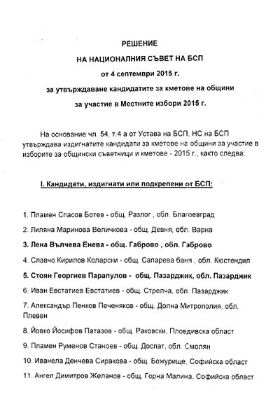 Колективната оставка на ръководството е от 27 септември 2015г. и към днешна дата това е остаряла информация. Още повече твърденията в декларацията, че Изпълнителното бюро на НС на БСП е взело решение за кандидата, който да бъде утвърден е в противоречие с чл.54, т. 4, б.а от Устава на БСП, който е категоричен, че кандидатите на БСП за кметове на общини се утвърждават от Националния съвет, а не от Изпълнителното бюро. Такова решение е взето на 4 септември 2015г., с което Иван Евстатиев Евстатиев е утвърденият от БСП кандидат. Прилагаме и копие от решението.